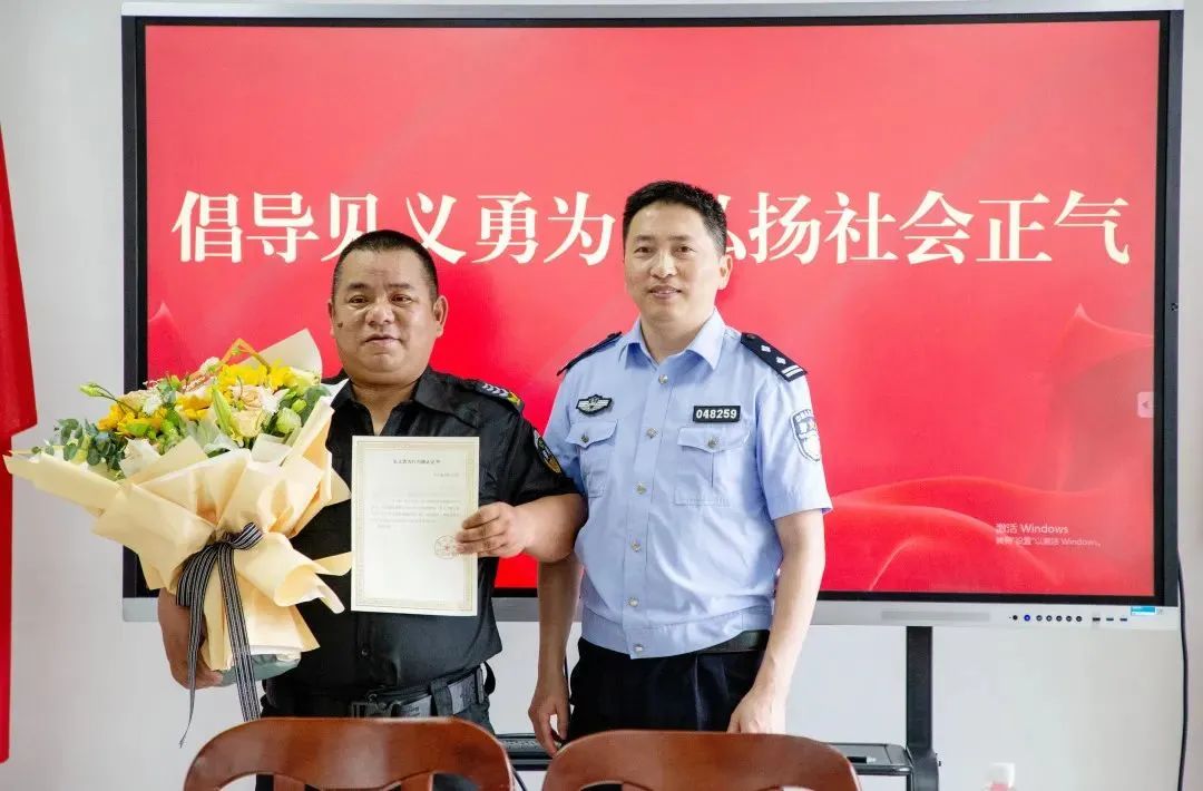 △市公安局治安大队副大队长徐亮为吴健颁发见义勇为行为确认证书