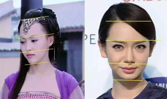 三庭五眼:由发际线到眉毛,眉毛到鼻尖,鼻尖到下颚为三庭。