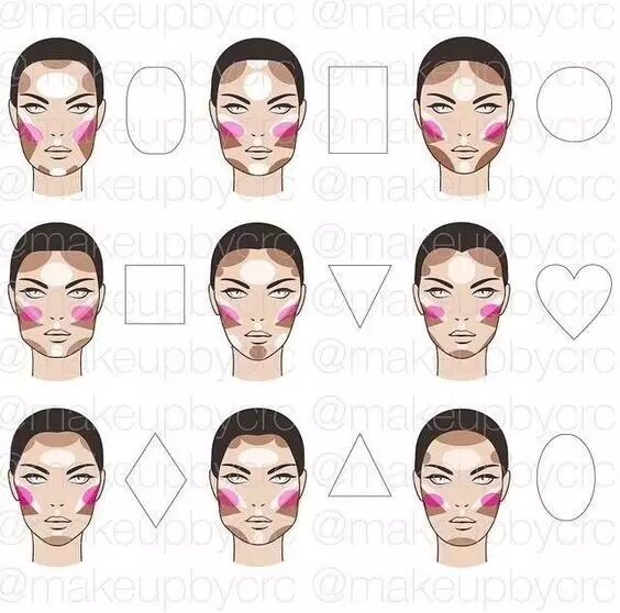 下面我们说一下高光和阴影。高光相当于把一束光照到你的脸上,阴影就是让这束光照不到你的脸上,好像不存在。下图是针对不同的脸型的修脸图,包括高光阴影甚至腮红的处理。