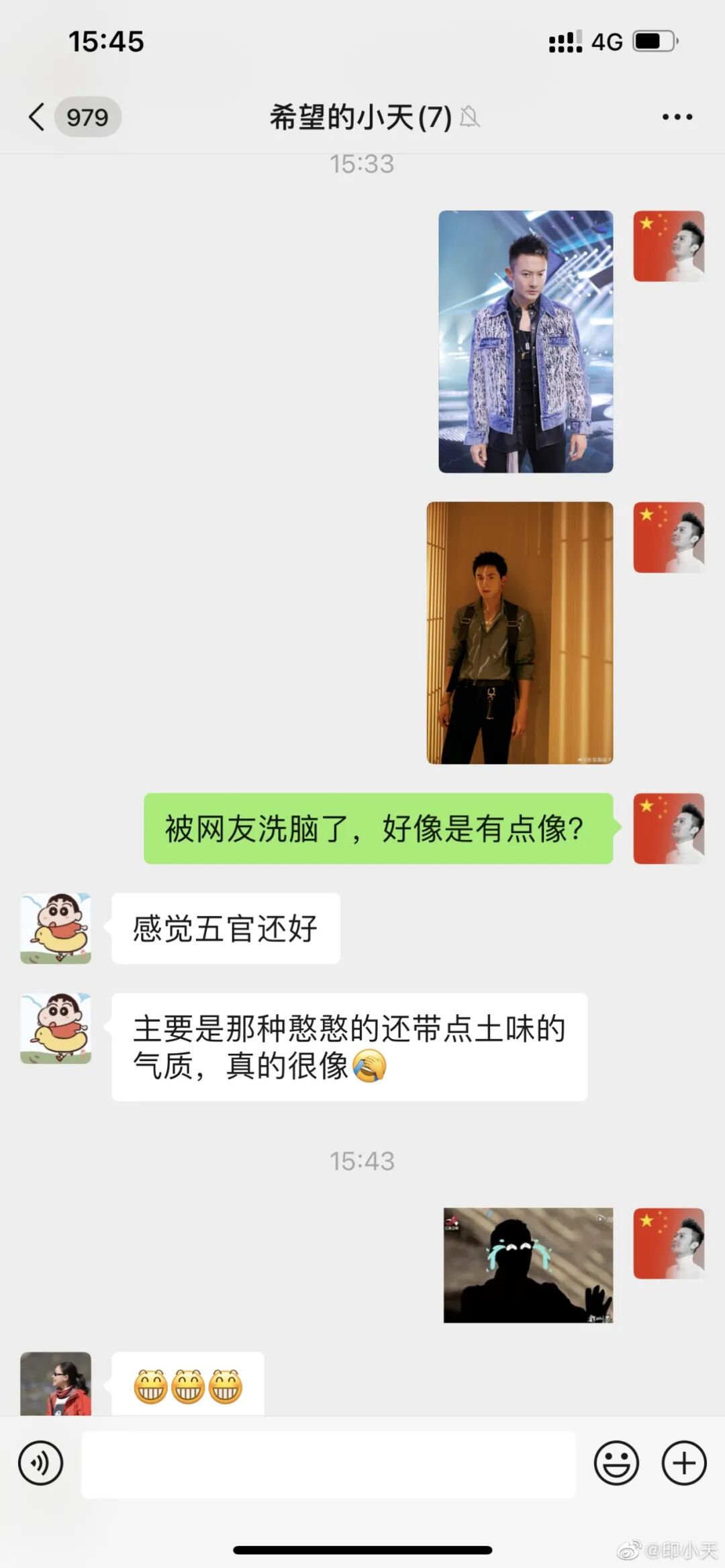 配的截图是他在群里跟别人聊这个事,有人回应他说“感觉五官还好,主要是那种憨憨的还带点土味的气质,真的很像”。
