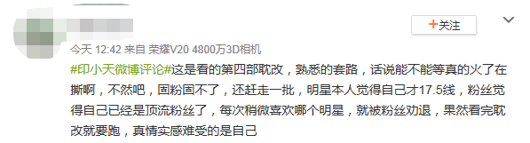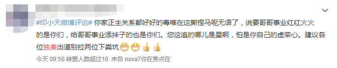 这话一出,有同感的网友就在印小天的微博下边咔咔整了几百转,场面一度从拐弯抹角的内涵转变为粉黑大战。