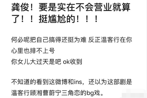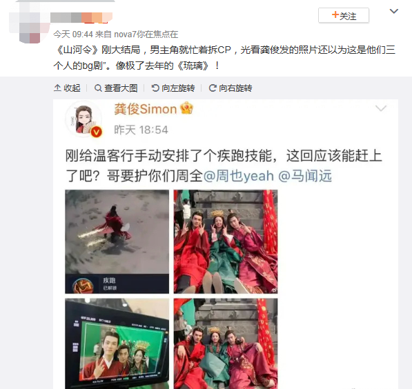 比如有人说龚俊大结局的那天没发张哲瀚演的周子舒,发的是和顾湘、曹蔚宁的合影,不知道的还以为这部剧是他们一家三口的bg剧,拆cp的心思未免太明显。