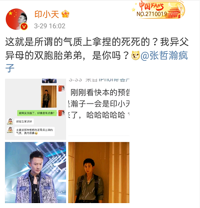 印小天自己看着也觉得有点像,就发微博@张哲瀚,说气质上拿捏得死死的,我异父异母的双胞胎弟弟是你吗?