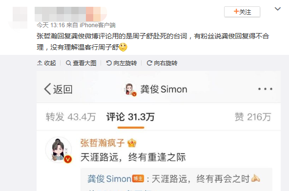 有人说张哲瀚回复龚俊微博评论用的是周子舒赴死的台词“天涯路远,终有重逢之际”,但龚俊的回应显然并没有get到张哲瀚的深层意思。