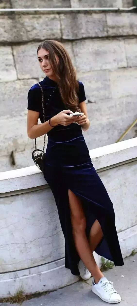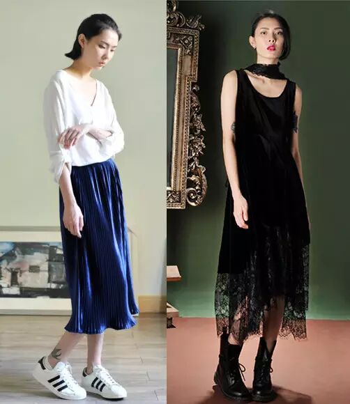 开叉款的裙子会更有女人味儿,混搭运动鞋把庄重感转变成了时髦,更加的适合日常穿搭。