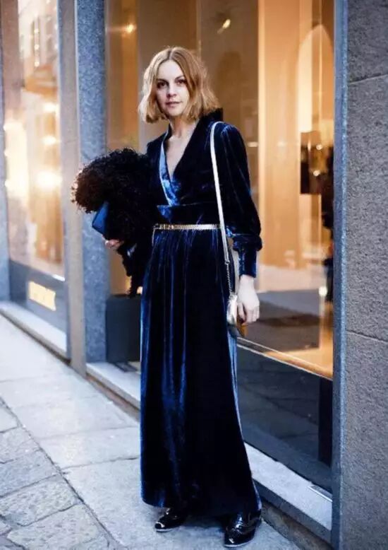 它让我们对这种仿佛在夜里都会发光,象征着优雅和昂贵的面料印象深刻。比起贵气逼人的皮草、金光四射的珠宝装饰来说,还是柔软的天鹅绒更接地气,适宜普通上街搭配。