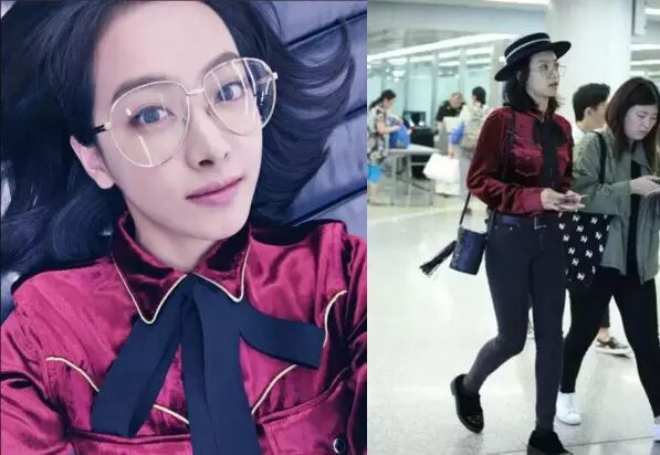 宋茜这身复古又俏皮的look里,最抢镜的莫过于这件酒红色天鹅绒衬衫,搭配复古平光镜,简直就像个贵族少女~