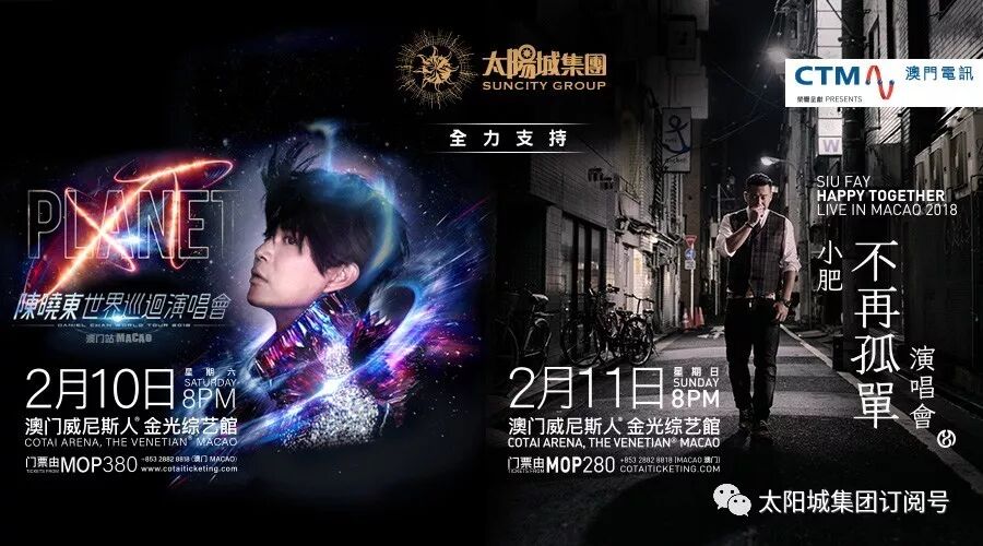 棋人娱乐制作及太阳娱乐演唱会联合主办,澳门歌手小肥演艺生涯第二个大型演唱会《小肥不再孤单演唱会》,2 月 11 日将在澳门威尼斯人金光综艺馆举行。