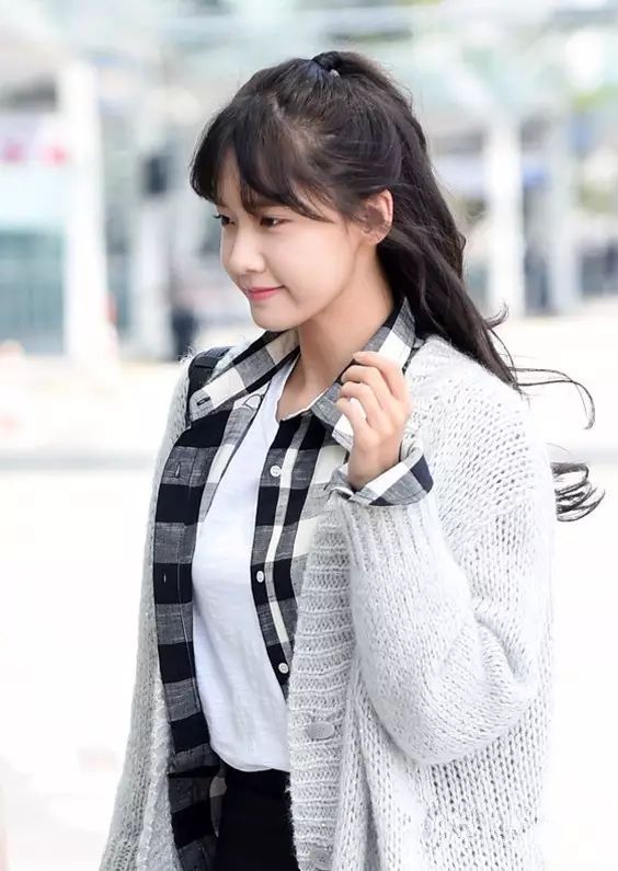 普通灰白格子衬衣内搭白T恤,经典的黑白不出错造型。外搭灰色针织外套,保暖又协调,加上软萌的空气刘海,完全一个邻家少女形象。