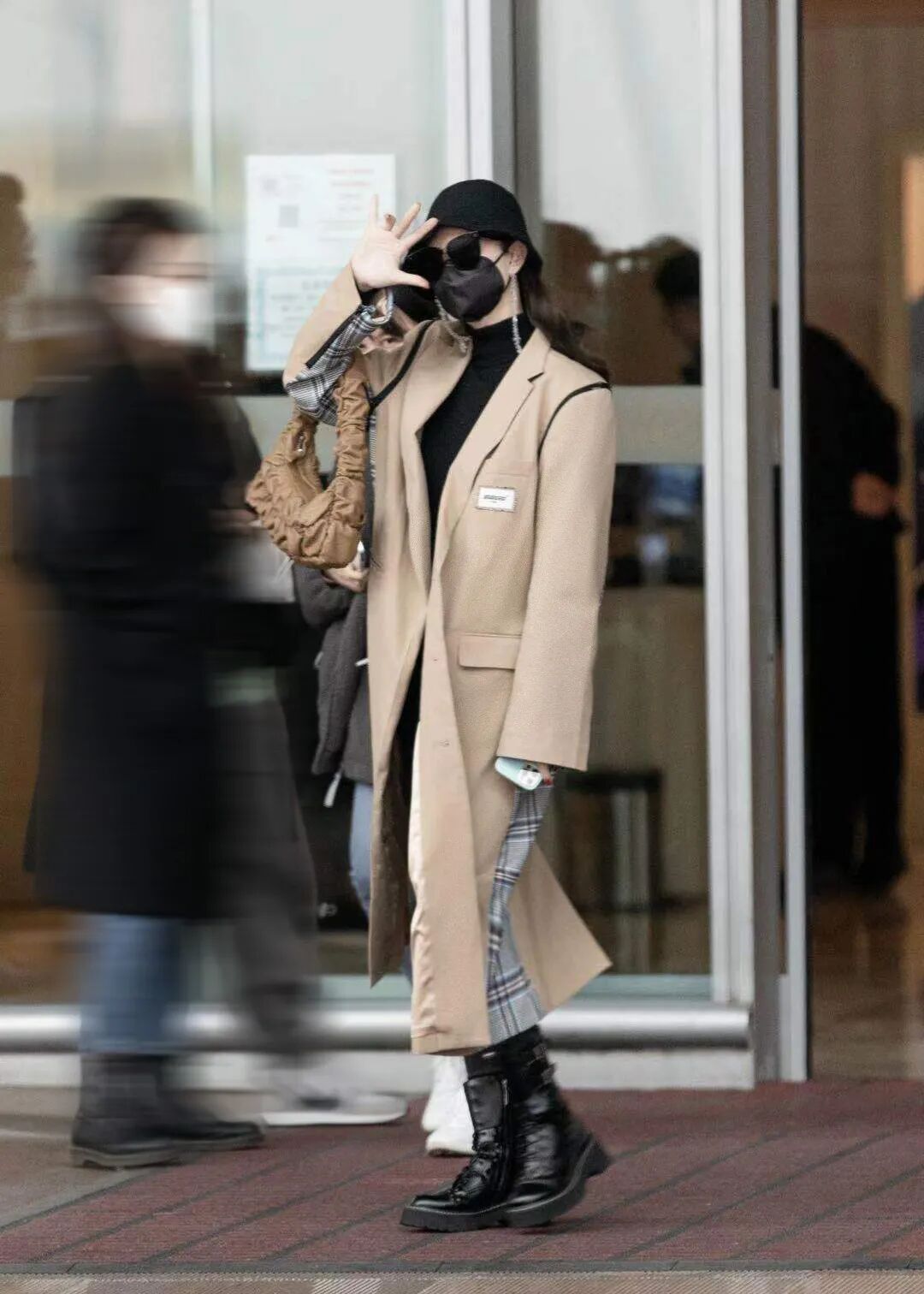 另一身黑色高领打底与浅咖色长风衣的组合,也是满满的时尚气息。黑色渔夫帽遮挡了凌冽的寒风,将发丝儿牢牢固定于帽檐下。女明星的气质真是摆在哪儿都能一眼认出的水平~