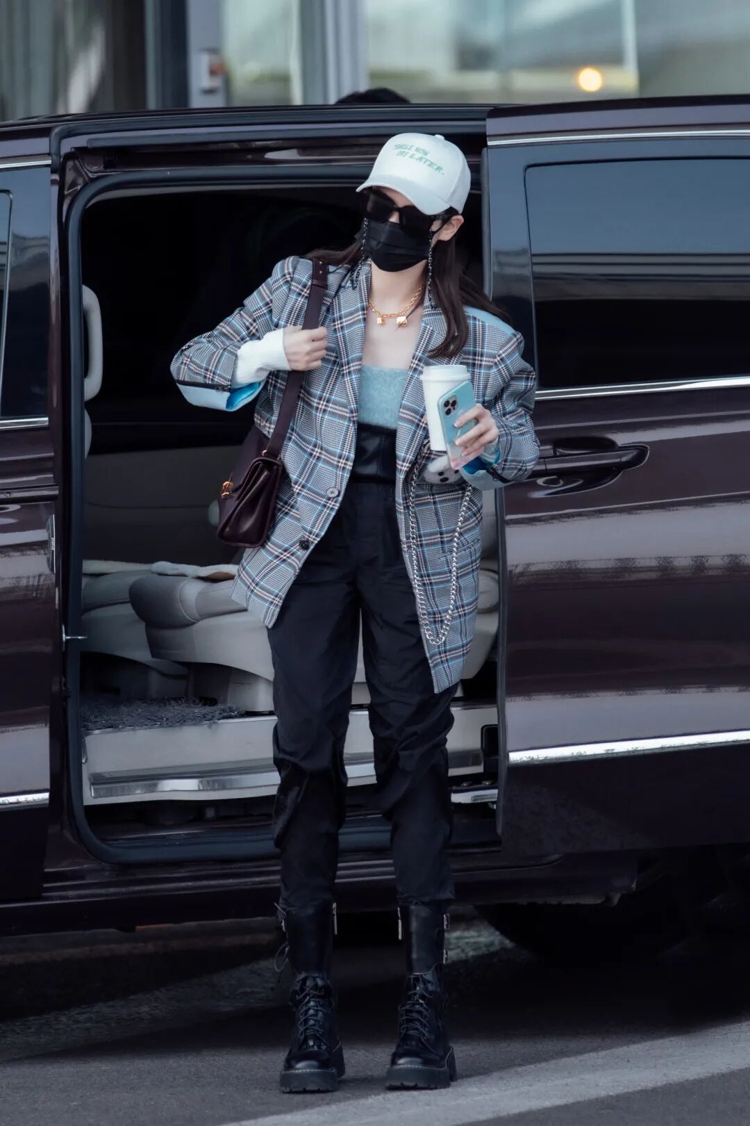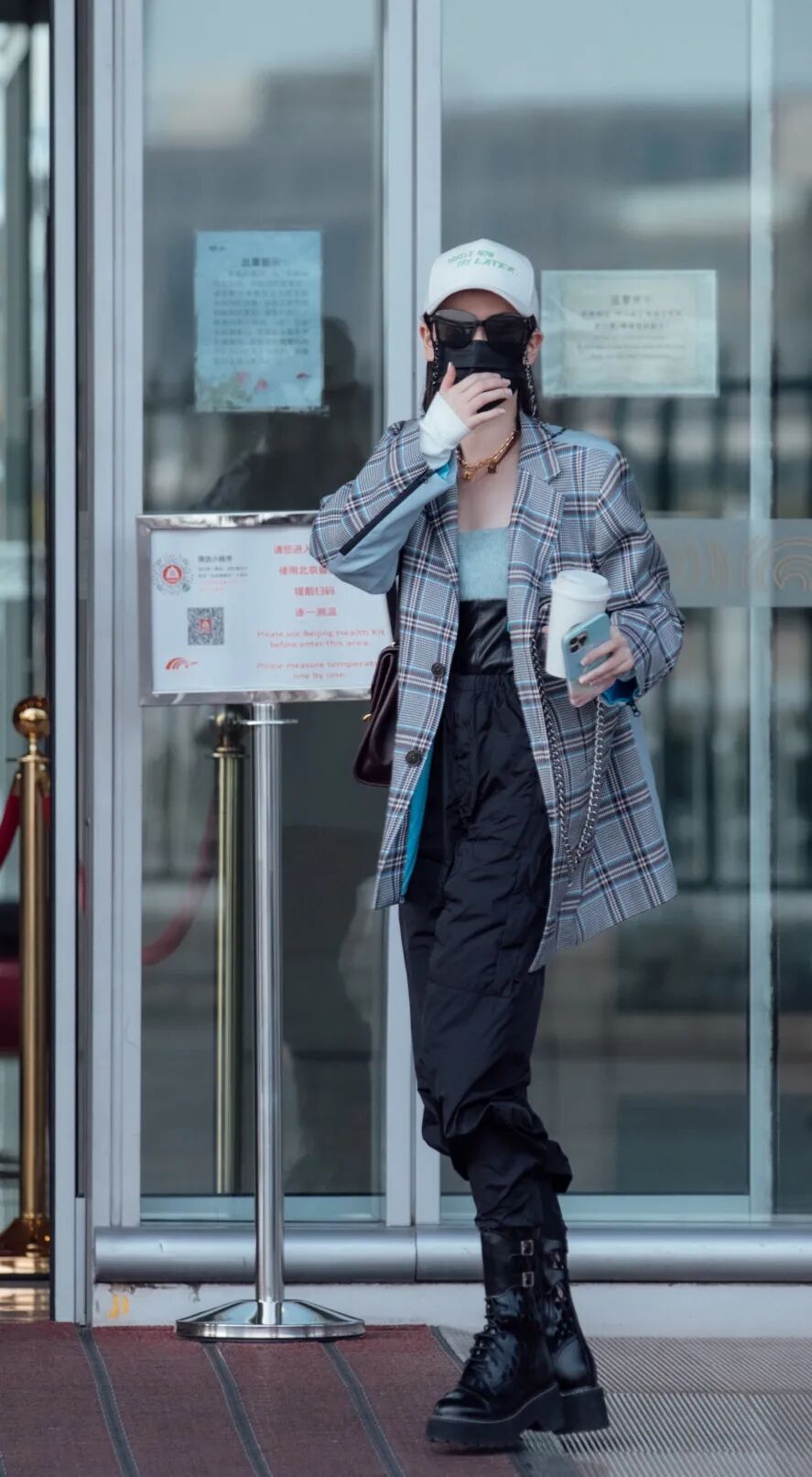 浅蓝色打底配上黑色高腰收脚裤,再搭一双黑色马丁靴,将身材比例拉得细又长。再披一件灰色细格纹西装外套,与白色鸭舌帽,瞬间布满通勤风。
