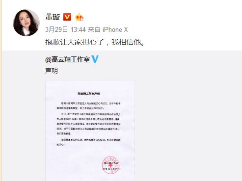 董璇还是一如既往地支持高云翔,刚被爆出,她就紧随工作室表态称让大家担心了,“我相信他。”