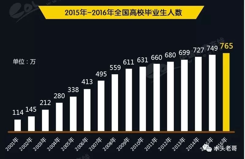 基数决定成败,树大自然招风。数以万计的中小学生加入了补课的行列,让中国的课外辅导竟然成为一个教育系统里的必须品,这是中国教育的悲哀,更是中国家庭的悲剧。当你如同莎士比亚的悲剧拉开序幕时,你已然成为舞台上的角色,做一道二年级的数学题:12*1000*3*6=216000(元),不知诸位能否看懂,简单说明,一年12个月,每个月一门课教辅费用1000元,按学3门计算,从初一到高三,学6年,这是基本的算法,有些家长从小学甚至幼儿园就开始了教育辅导的长征之路,这个数字可能会反若干倍,就按现在估计从初中到高中的教辅费用就达20万之多,如果这样算,官方公布的8000亿也算不了什么,入口是这样,那么出口又是如何呢?让我们静静观瞧。人力资源社会保障部部长尹蔚民谈了2016年的就业形势,分三个方面:第一个方面,化解过剩产能会造成一部分职工下岗;第二个方面,经济下行压力比较大,有一部分企业生产经营困难,会造成企业用工不足;第三个方面,以高校毕业生为主的青年就业群体的数量还在持续增加,这将对就业产生很大的压力。今年的高校毕业生是765万人,比去年又增加了16万人,而且中职毕业生和初高中毕业以后不再继续升学的学生大约也是这个数量。青年的就业群体加在一起大约有1500万左右,这个压力也是非常大的。这就是我们大学生的出口,一长串的文字就是三个字——就业难。