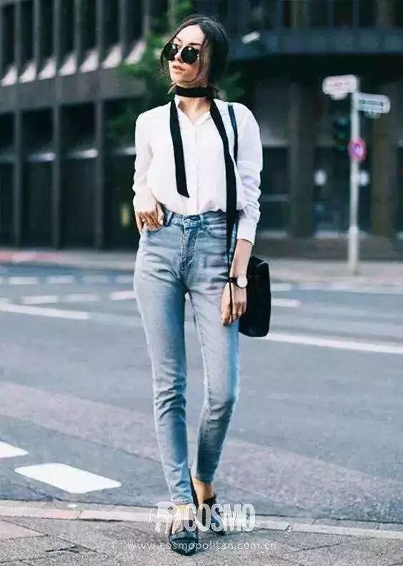 只需一条黑色丝带随意搭在衬衫两边就会显得很帅气。