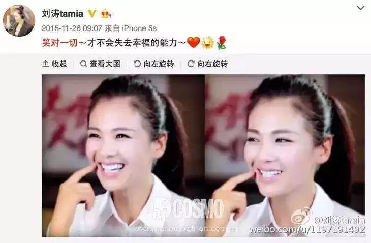 刘涛在微博里说,“笑对一切,才不会失去幸福的能力”。