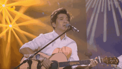 手握一把吉他,坐在桌子上,正在给大家开演唱会...