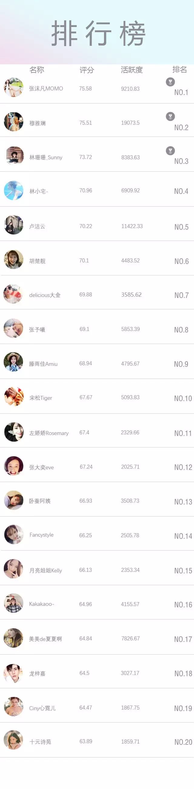 本周top排行前5名分别是 张沫凡MOMO、穆雅斓、林珊珊_Sunny、林小宅、卢洁云与上周相比本周张沫凡又回到排行榜第一,而上周第一的林小宅则回到第四,下面来看看具体的数据。