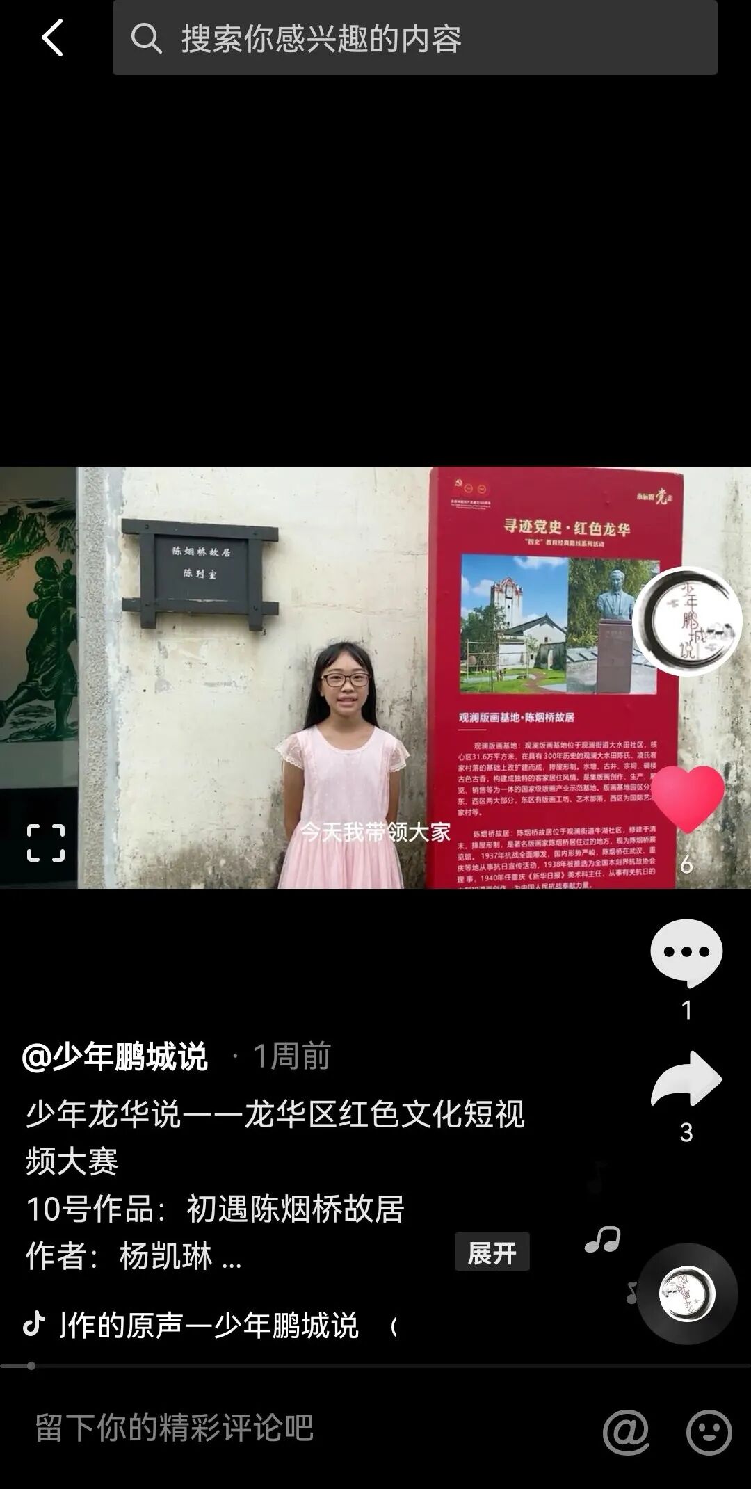 喜讯!由五年级三班同学杨凯琳参与拍摄的龙华少年说短视频《初遇陈烟桥陈故居》入围龙华区10强决赛!