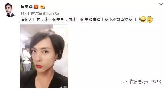 “这个大红唇,来一个美图,再来一个美颜滤镜!我也不敢直视我自己”黄宗泽微博中写道,并附上了哭笑和捂脸的表情。