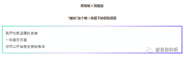 基于英文原曲,周笔畅给这首歌中文词创作的唯一命题:暧昧。总能以绝美视角,将暧昧的感官悉数打通,以千变万化的意象构筑起迷幻美学的高手,唯有周耀辉了。