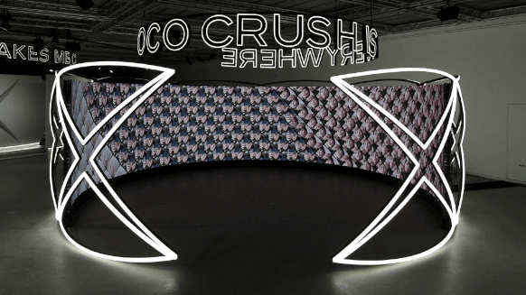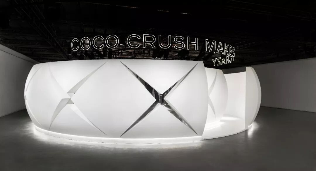 现场还有搭建成COCO CRUSH戒指形状的巨型装置,弧边方形格纹所拼接的屏幕上播放着COCO CRUSH的视频。