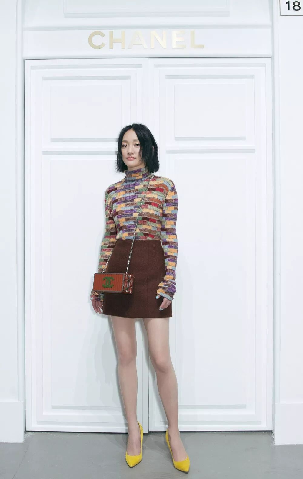 周迅身着CHANEL 2018“巴黎-汉堡”高级手工坊系列针织上衣和半裙,搭配晚宴包,佩戴CHANEL高级珠宝 COCO CRUSH系列18K金耳环和戒指。
