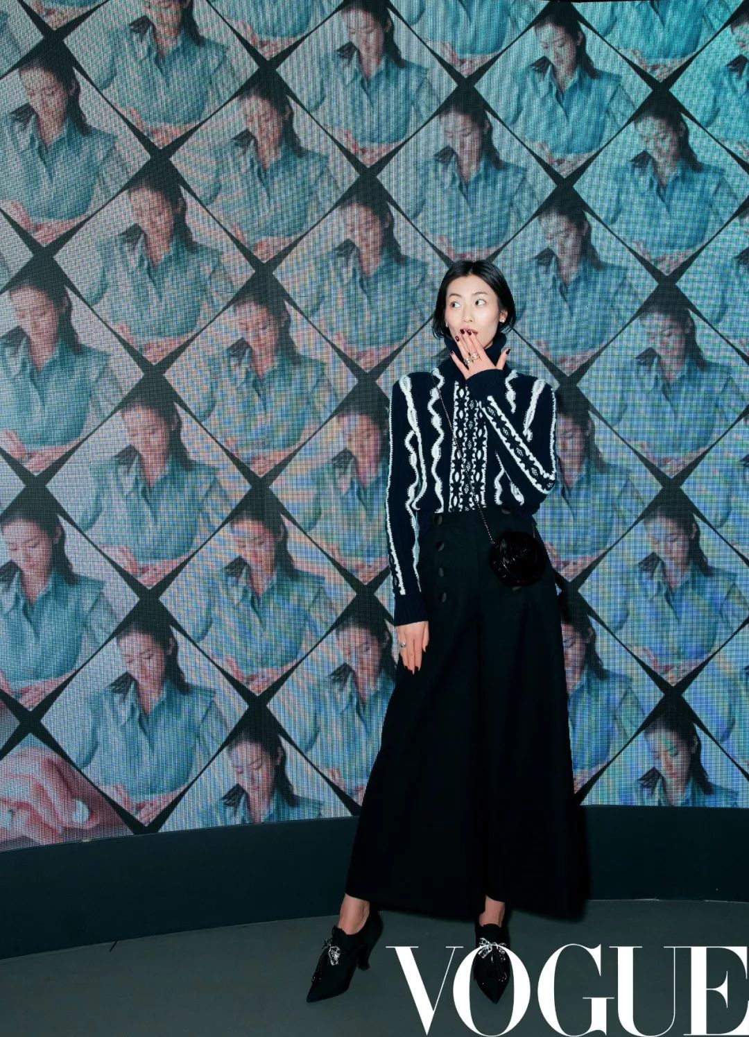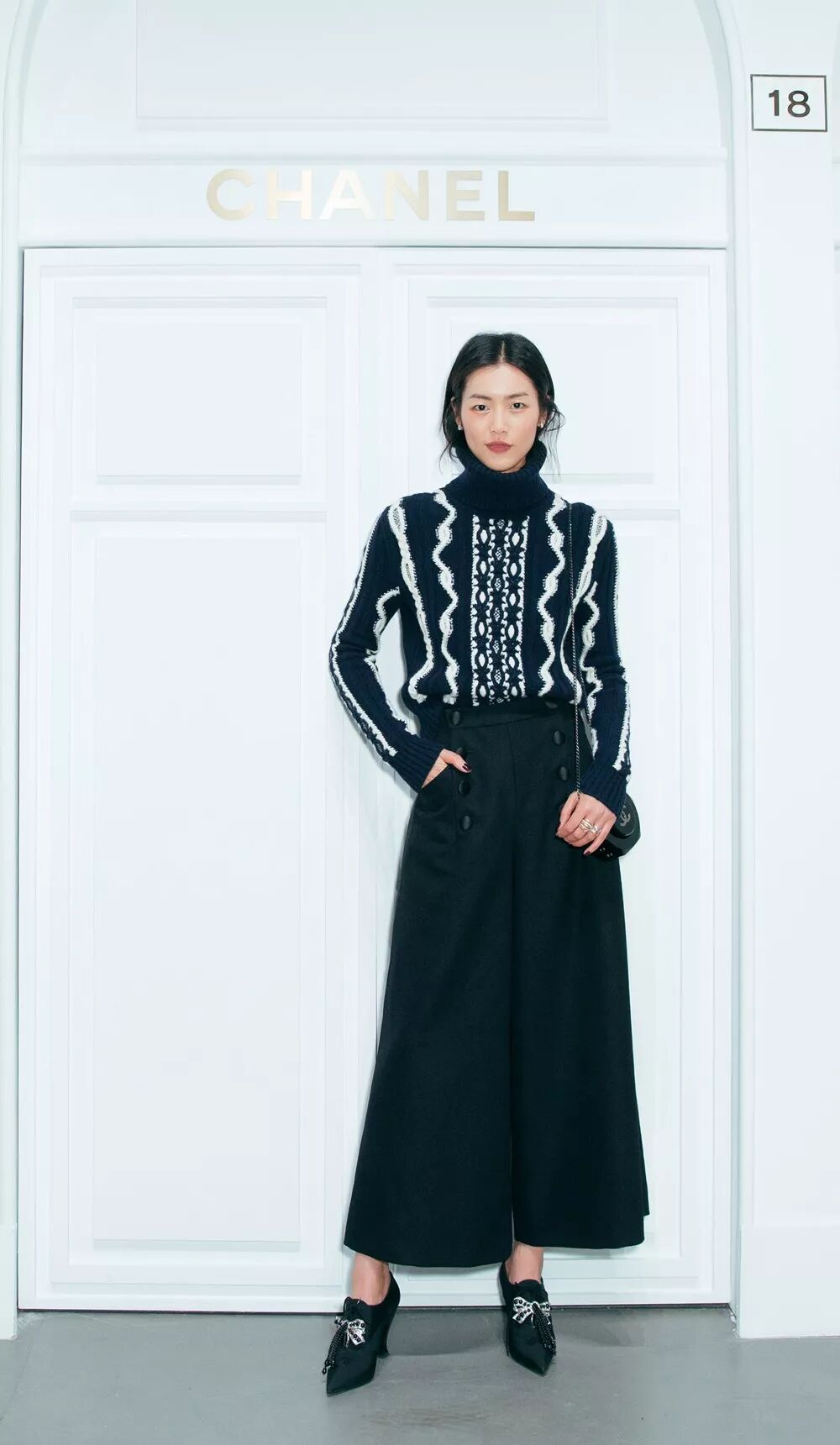 刘雯身着CHANEL 2018“巴黎-汉堡”高级手工坊系列毛衣和水手裤,搭配晚宴包,佩戴CHANEL高级珠宝 COCO CRUSH系列18K金耳环和戒指。