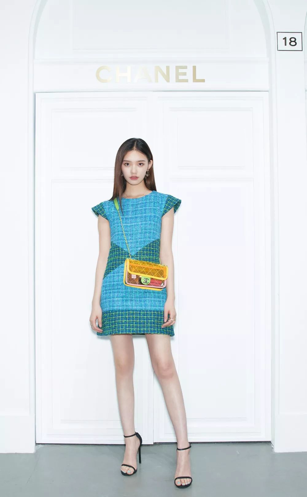 林允身着CHANEL 2018春夏高级成衣系列连衣裙,搭配透明PVC手袋,佩戴CHANEL高级珠宝COCO CRUSH系列18K金戒指和项链。