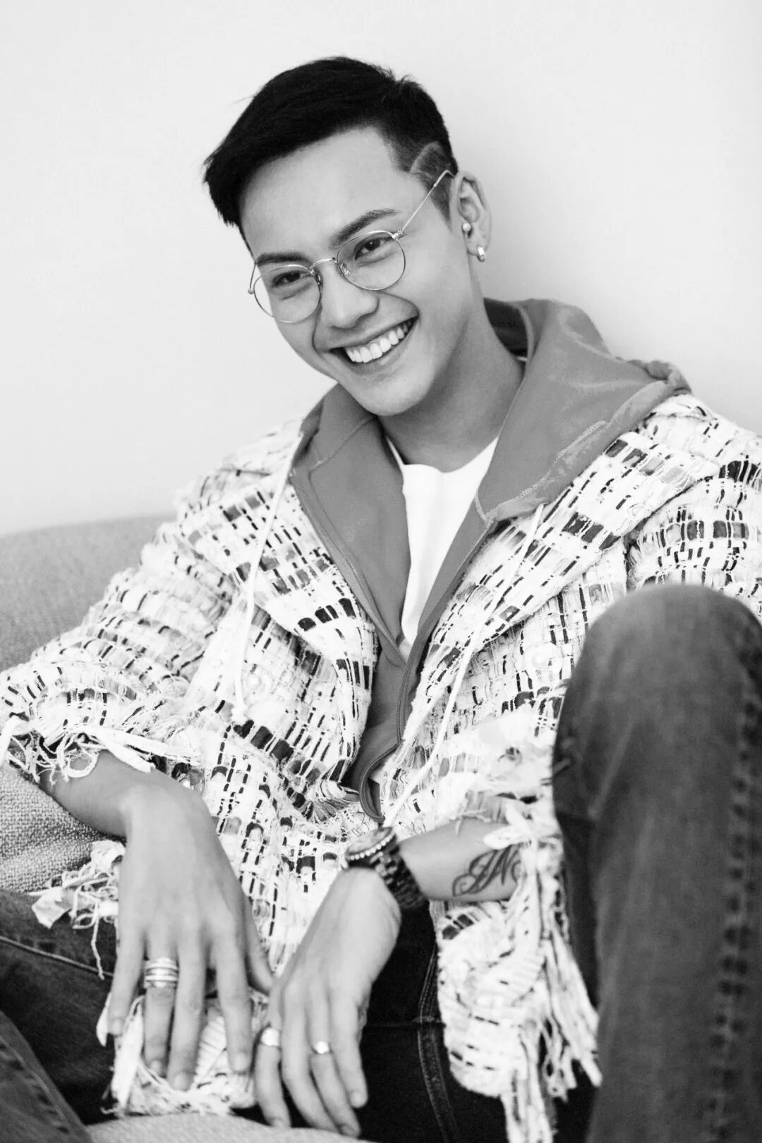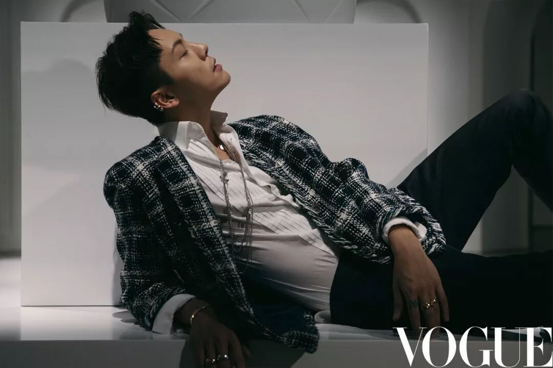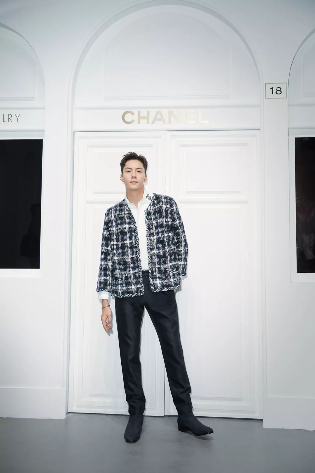 陈伟霆身着CHANEL 2018春夏高级成衣系列斜纹软呢外套,佩戴CHANEL高级珠宝 COCO CRUSH系列18K金耳环,戒指和手镯。