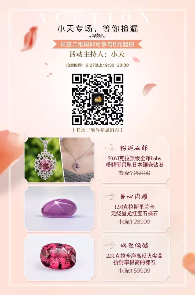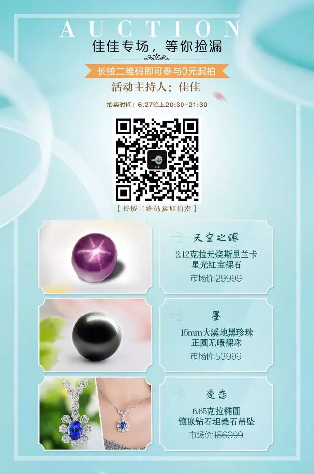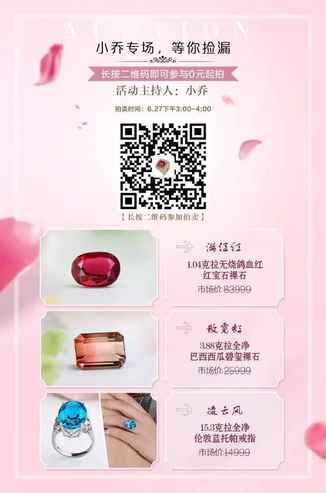 宝姐助理小乔、小天、佳佳朋友圈发起总计3场共9款珠宝全部0元起拍活动,每次加价1元起,规定时间内,最终价高者得宝石,如最后有相同价格,以先付款确定。