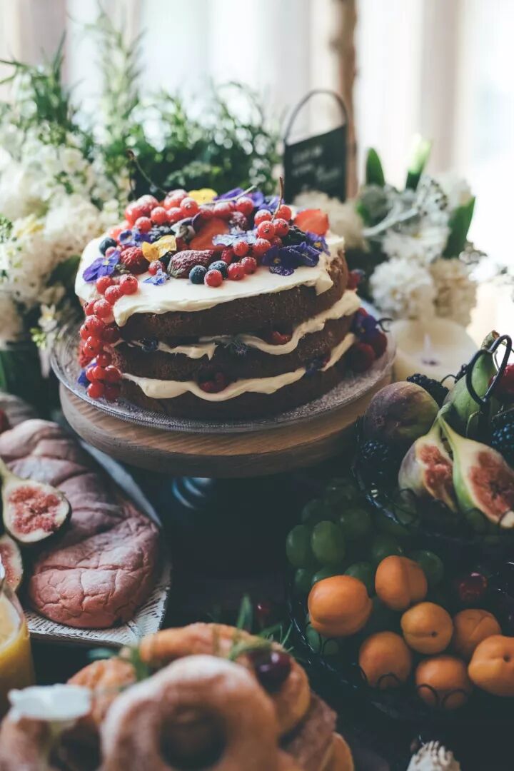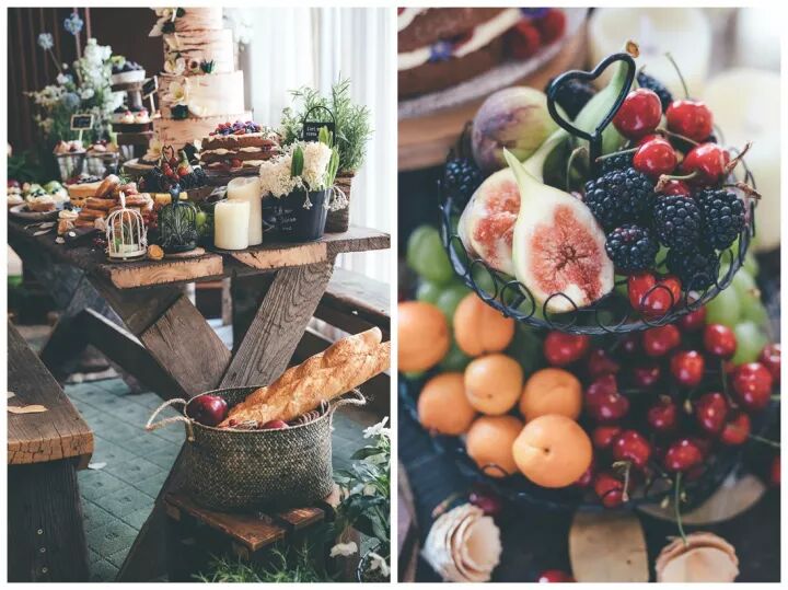 为了契合整个森系的主题,甜品台没有选择传统的翻糖蛋糕,而是以法棍,蓝莓派,鲜花裸蛋糕为主。