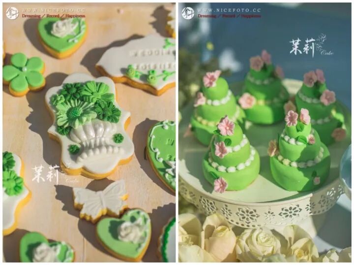 洁白的蛋糕之上浅浅淡淡的开出花,明媚却不耀眼,赋予了蓬勃的生命力。最经典的白绿色,即使现在看起来也不过时。