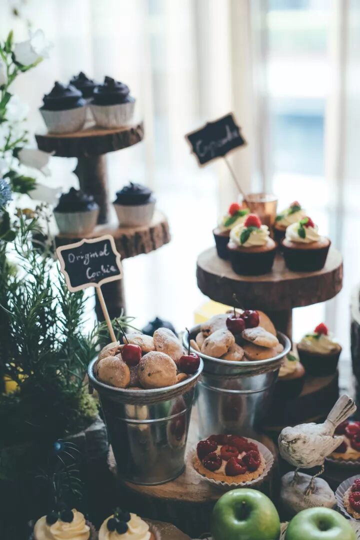 裸蛋糕及原木绿植的搭配简直让人眼前一亮。简简单单的原木架与诱人的甜品相结合,清新又文艺。