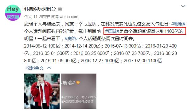 天啦噜,小鹿成了首个个人词条阅读量破了1100亿的爱豆↓