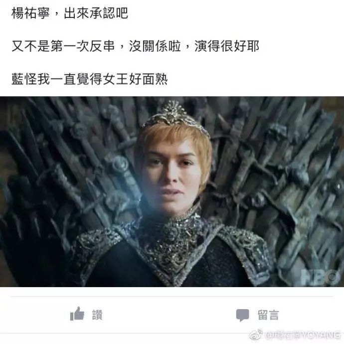有网友恶搞杨祐宁,说权游里瑟曦是他反串的,他呵呵一笑,欣然应允。这个锅也是接的顺溜。