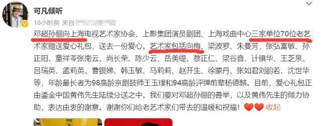 孙俪邓超夫妇为上海70多位老艺术家捐赠爱心物资,却被主持人曹可凡的一波“吹捧”给坑惨了!