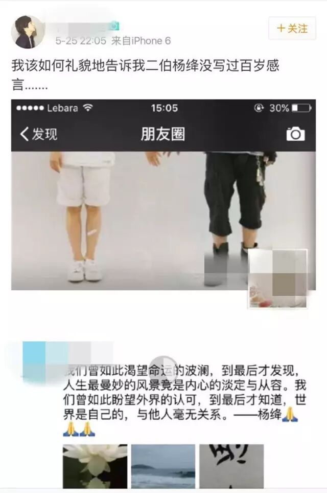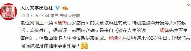 面对朋友圈“杨绛百岁感言”疯狂刷屏,有人在微博问,“我该如何礼貌地告诉我二伯杨绛没写过百岁感言。。。”
