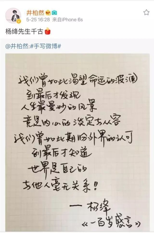 其实,平心而论,井柏然的字挺有特点,在明星里的确突出,也正因此,他发的这张手写微博的图,就这样被当成了“杨绛先生的手迹+杨绛先生”的话,错上加错、以讹传讹地流传开来。