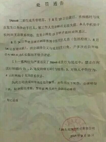 首先是入团初期的“打人事件”。当时有自称知情者的人上贴吧爆料,说曾艳芬动手打了当时的队长徐言雨,并晒出揉成一团、疑似从垃圾桶里捡出来的处罚通告。