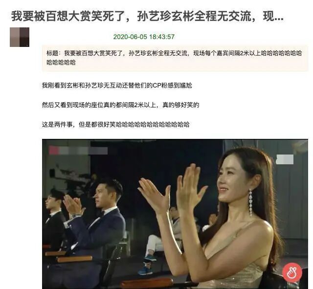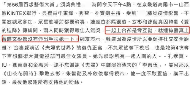 根据媒体报道的细节,两人一起上台时全程零互动,就连孙艺珍上台时,玄彬都没有伸出手扶她一下。