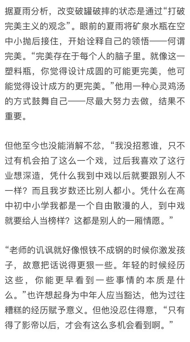 考取中央戏剧学院表演系之后,夏雨反而破罐破摔。带着影帝光环进中戏,他听到各种风凉话,“都拿影帝了,是你教老师还是老师教你?”老师想把他树立成榜样让同学学习,但发现他是“扶不起的阿斗”——同学都来看他的汇报演出,夏雨还没上台就开始腿软、忘词。被老师讥讽后他信以为真,一度想退学。