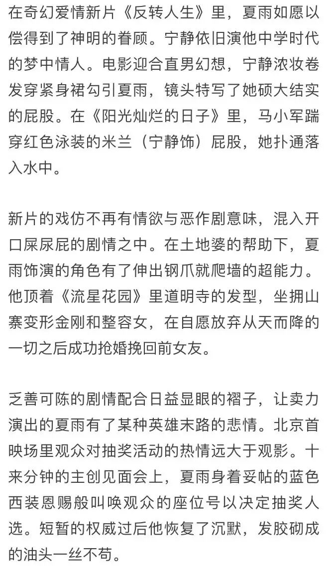 在过往的采访中,夏雨不客气地表露出对马小军这一话题的不耐烦,但总有人挑衅地问他为什么再也没拍过超越《阳光灿烂的日子》的戏。“没有可比性,除非我再演一遍马小军你才能判断是不是超越了,对不对?”假想无法成真,自然也无法打消怀疑。夏雨有时还会在心里帮腔,“为什么我现在没有拍出一个作品让人可以提?”
