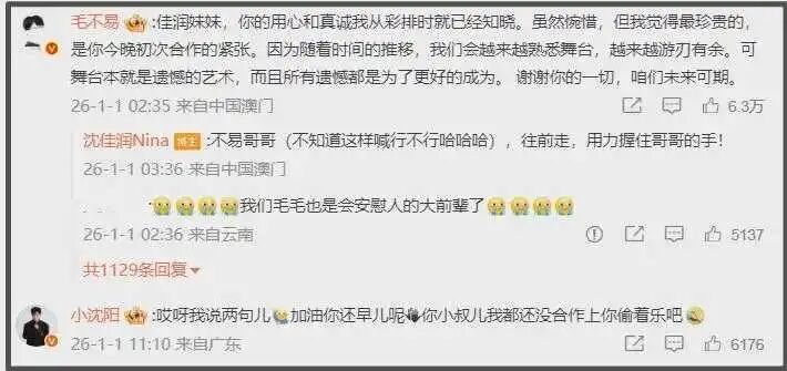 随后,合作搭档毛不易在评论区暖心解围,称彩排时便感受到了她的真诚与付出,鼓励她"继续加油,未来可期"。