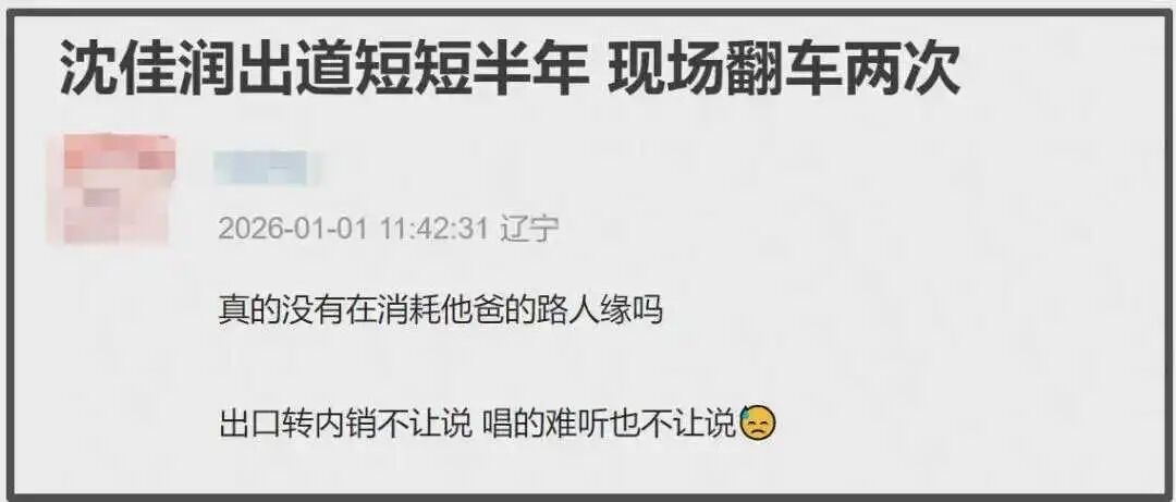 在我看来,沈佳润跨年跑调风波之所以愈演愈烈,本质上不是网友"苛责新人",而是对"星二代躺赢""资源错配"的集体反抗。