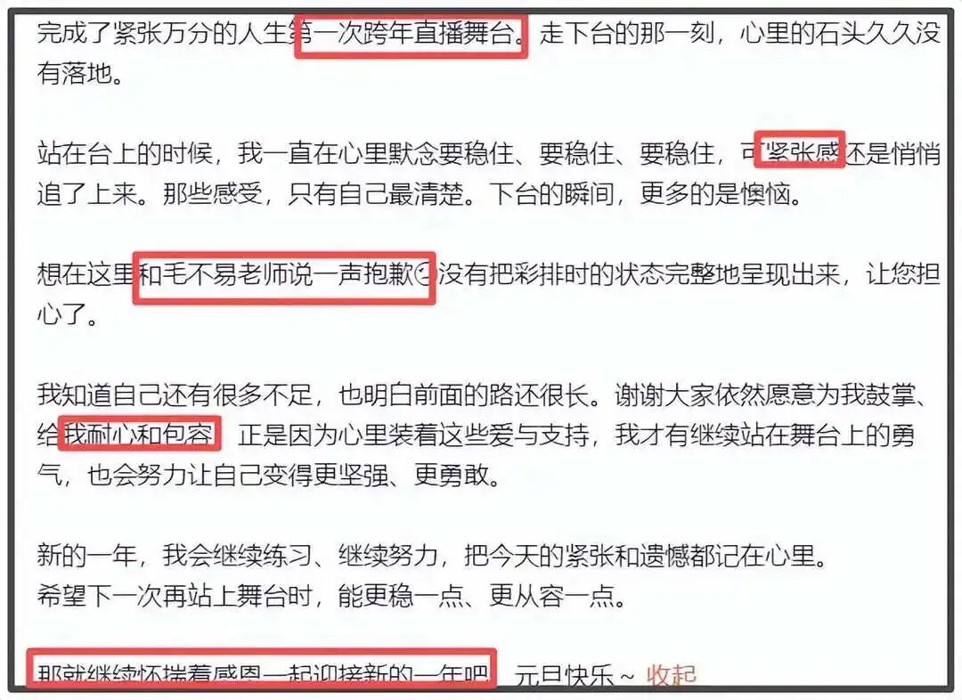 表演结束后,沈佳润第一时间发布长文致歉,字里行间满是愧疚,坦言自己因过度紧张导致发挥失常,承诺会正视自身不足,未来将加倍努力提升业务能力,同时感谢观众的包容与理解。