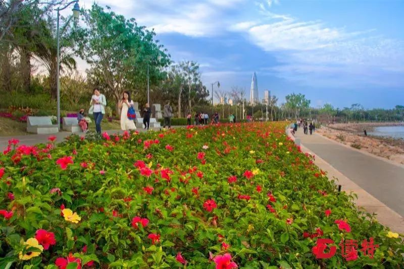 流花山沿海观光道的矮化大红花花带,如同为深圳湾绣上了彩色的花边。