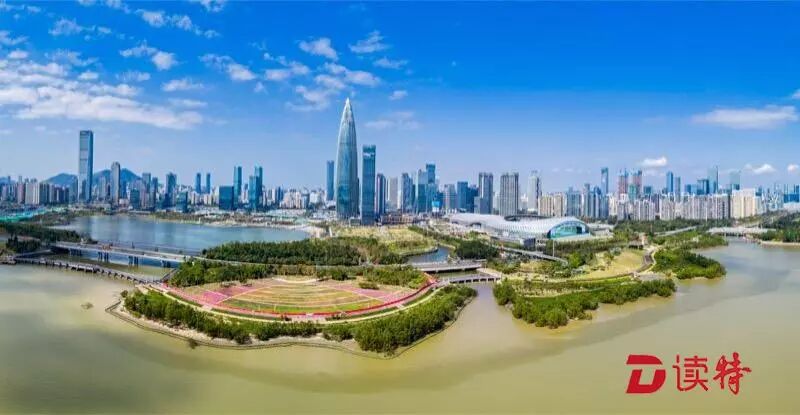 航拍镜头下的深圳湾公园流花山点缀在高楼与大海间,形成美丽的都市海上田园风光。