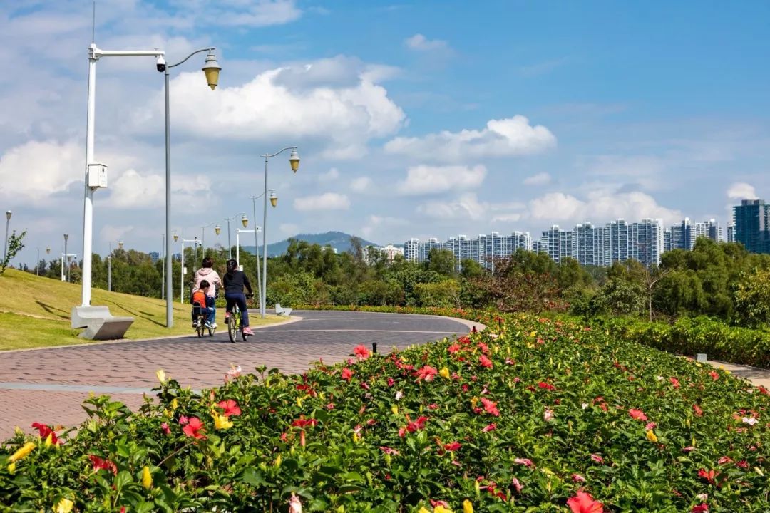 婚庆广场轻盈的白色廊架上,代表着幸福、纯洁的玫瑰、天鹅、蝴蝶等彩色绿植造型,昭示着爱情的甜蜜与美好。碧海蓝天间,姹紫嫣红的花海、花带、花廊似锦缎般点缀着美丽的深圳湾公园,处处是美景,步步入画来。市民或漫步或骑行,都能体验到满满的幸福感!