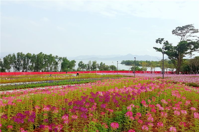 由各色鲜花组成的流花山花廊景观,点缀着美丽的深圳湾公园。