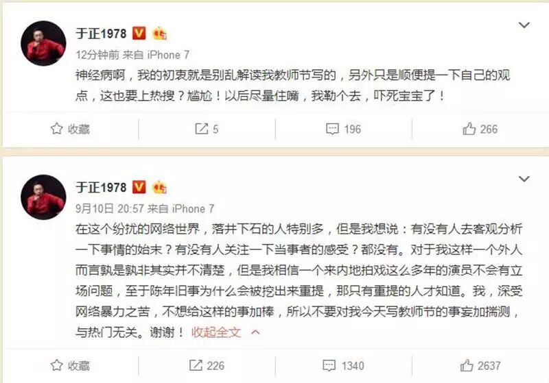于正发文称:“在这个纷扰的网络世界,落井下石的人特别多,但是我想说:有没有人去客观分析一下事情的始末?有没有人关注一下当事者的感受?都没有。对于我这样一个外人而言孰是孰非其实并不清楚,但是我相信一个来内地拍戏这么多年的演员不会有立场问题,至于陈年旧事为什么会被挖出来重提,那只有重提的人才知道。我,深受网络暴力之苦,不想给这样的事加棒,所以不要对我今天写教师节的事妄加揣测,与热门无关。谢谢!”而今天早上于正再次表示自己说这段话是说一下自己的观点,没别的意思。于妈可能忘记自己也是易黑体质的人,这种时候就不该玩站队的。